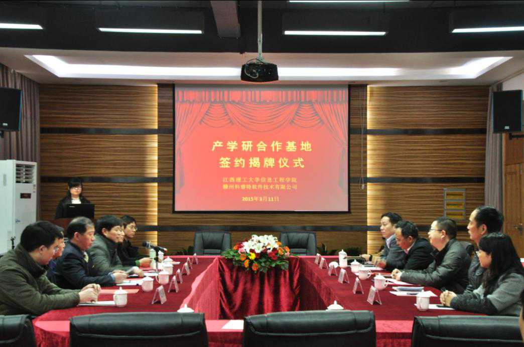 2015年3月11日,我公司与江西理工大学信息工程学院《产学研合作基地》签约及揭牌仪式在科睿特软件研发中心隆重举行。出席人员有江西理工大学副校长邱廷省、区委常委、区政府副区长傅永宝、区民企局局长钟群、区就业局局长刘晓梅、章贡经开区副主任章贞容、区经信委信息中心主任卢和雄、江西理工大学教务处处长丁凌蓉,信息工程学院院长张水平、书记黄支民、副院长廖列法、副院长汪峰,科睿特董事长曾彬。