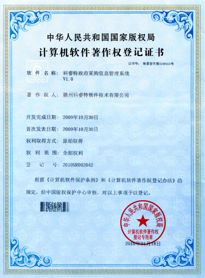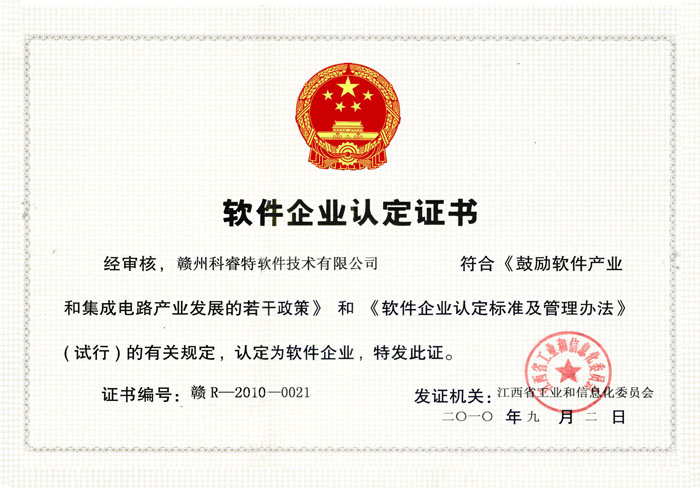 近日,江西省工业和信息化委员会发文,赣州科睿特软件技术有限公司(简称“赣州科睿特公司”)获得“软件企业”认证,其自主开发的电子政务软件《科睿特政府采购信息管理系统V1.0》取得“软件产品登记”。目前,赣州科睿特公司成为我市首家也是目前唯一通过“双软认证”的高科技企业。
