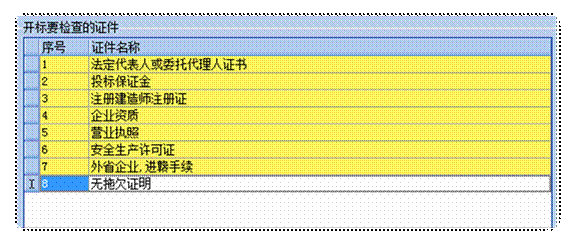 注意:黄底部分为招标文件中固定的检查项目,不能删除,如果当前项目中还有其他证件需要在开标时查验,自行添加;