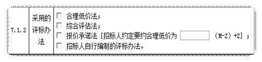 注意:( 1)如果选择“报价承诺法”,需要填写要约合理低价的系数,否则开标时,无法确定有效报价的范围;(2)如果选择最后一个“招标人自行编制的评标办法”目前还无法采用电子化评标;
